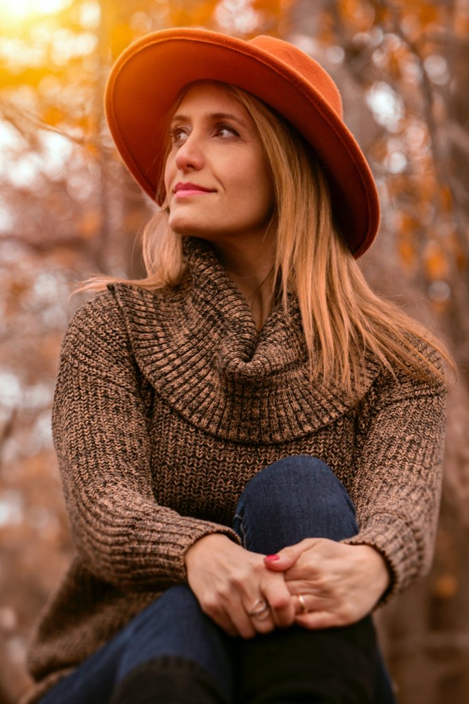 The woman is wearing a brown sweater or blue denim jeans and orange hat.