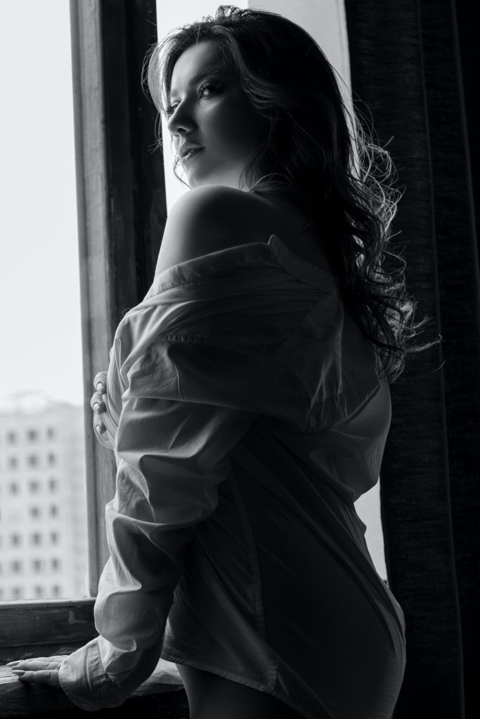 Pretty woman in white button up shirt.
